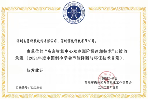 在人工智能算力需求爆发式增长与 “双碳” 战略深度推进的双重背景下,深圳易信科技股份有限公司、深圳博健科技有限公司联合申报的 “高密智算中心双冷源阶梯冷却技术”,凭借其在高密度场景下的极致能效表现与绿色低碳特性,成功入选《2024年度中国制冷学会节能降碳与环保技术目录》。入选《2024年